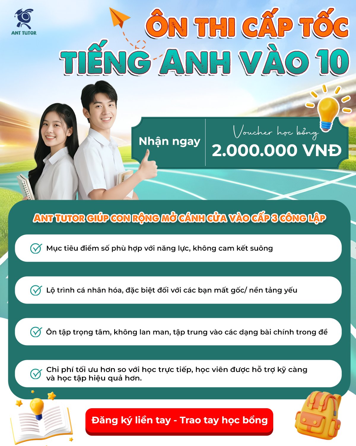 Trong bối cảnh kỳ thi vào lớp 10 ngày càng cạnh tranh, khi các Sở Giáo dục & Đào tạo đã lựa chọn môn thi thứ 3 là Tiếng Anh thì việc lựa chọn một chương trình luyện thi bài bản, bám sát đề thi và phù hợp với năng lực cá nhân là yếu tố quan trọng giúp học sinh đạt kết quả tốt. ANTutor không chỉ cung cấp kiến thức mà còn xây dựng chiến lược học tập, tư duy làm bài và sự tự tin cho người học. Ở ANTutor còn cá nhân hoá lộ trình và định hướng sớm giúp các em học sinh và phụ huynh hiểu năng lực, xuất phát sớm và tăng tốc với các chương trình của trường Chuyên và các lớp chuyên tiếng Anh.